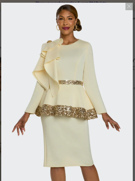 Donna Vinci Style 12231 2PC Jacket/Skirt Suit Poly/Spandex Fabric Trimmed Gold Sequins And A Beautiful Rhinestone Broach Design To Fit On The Shoulder