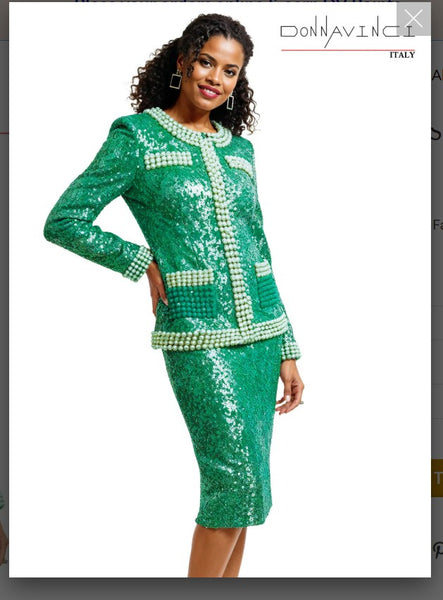 Donna Vinci Style 12234 2PC Jacket/Skirt High Quality Sequin Fabric With Stretched Trimmed With Mint Colored Pearls