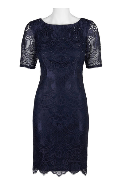 ADRIANNA PAPELL AP1E203164 Scoop Neck Short Sleeve Zipper Back Bodycon Illusion Nylon Lace Dress Approx. 36 IN / 91 CM length. Nylon Lace (100% Nylon) Lining (100% Polyester)