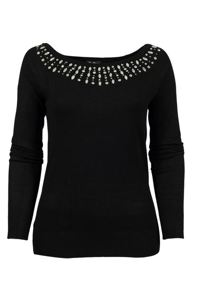 Vila Milano 10211 041 By Sioni Knit Sweater A glamorous, yet classy boat-neck long sleeve sweater with gun metal studs and rhinestone detail. Brand: Vila Milano by Sioni.KNIT NYLON (50% Nylon 25% Viscose 25% Wool) Care; Cold Hand Wash, Lay Flat Dry, Do Not Iron